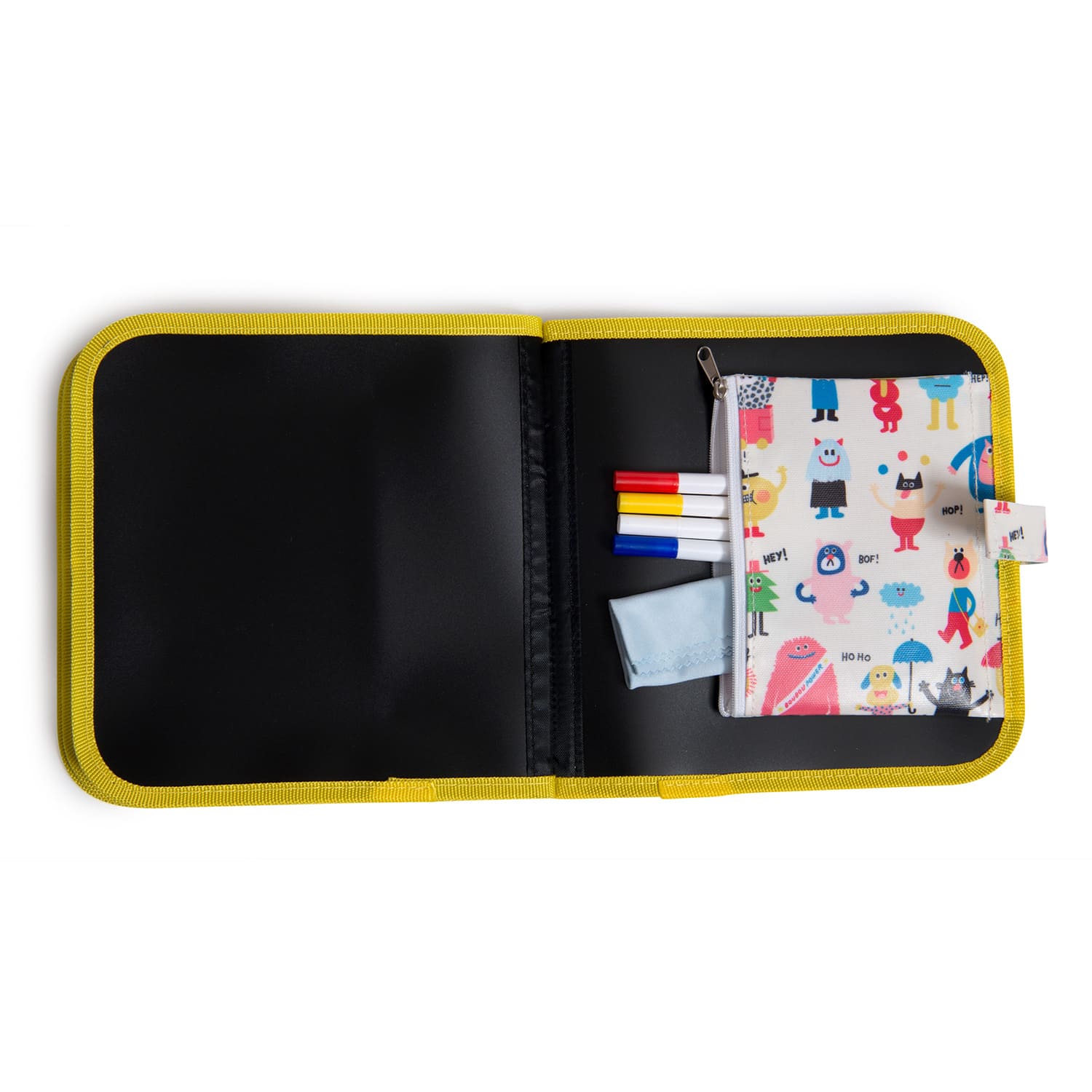 Ce livre ardoise de voyage comprend 10 pages, 4 crayons effaçables dans leur pochette à zip et un chiffon à humidifier, pour dessiner, effacer, et recommencer ! Et pour les plus joueurs, 2 grilles de jeu pré dessinées : un morpion et un pipopipette !