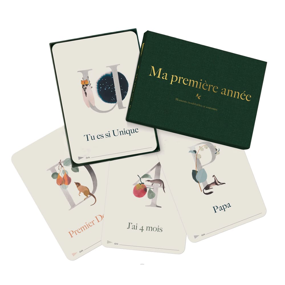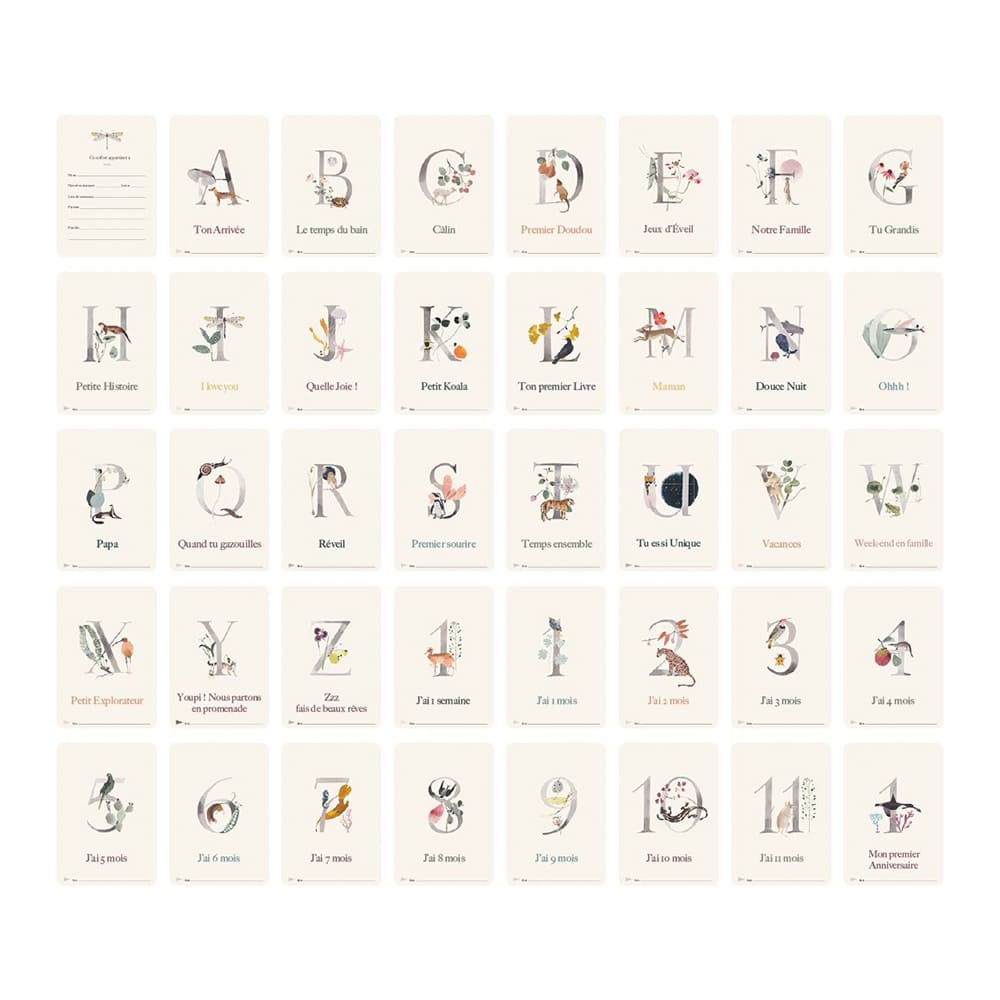 Coffret de 40 cartes : 26 cartes sous forme d'abécédaire pour capturer les premières fois et 14 cartes de la première semaine jusqu'au premier anniversaire.