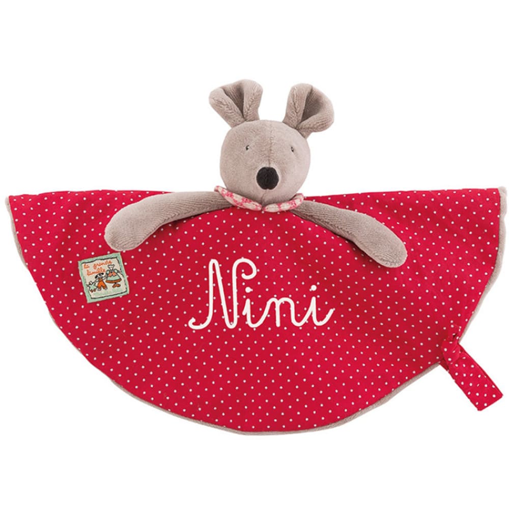 Petite souris Nini dans sa robe en coton imprimé pois, doublée velours pour ce doudou plat, facile à saisir par les petites mains de bébé. Il comprend un lien attache tétine. Doudou personnalisable au prénom de l’enfant.