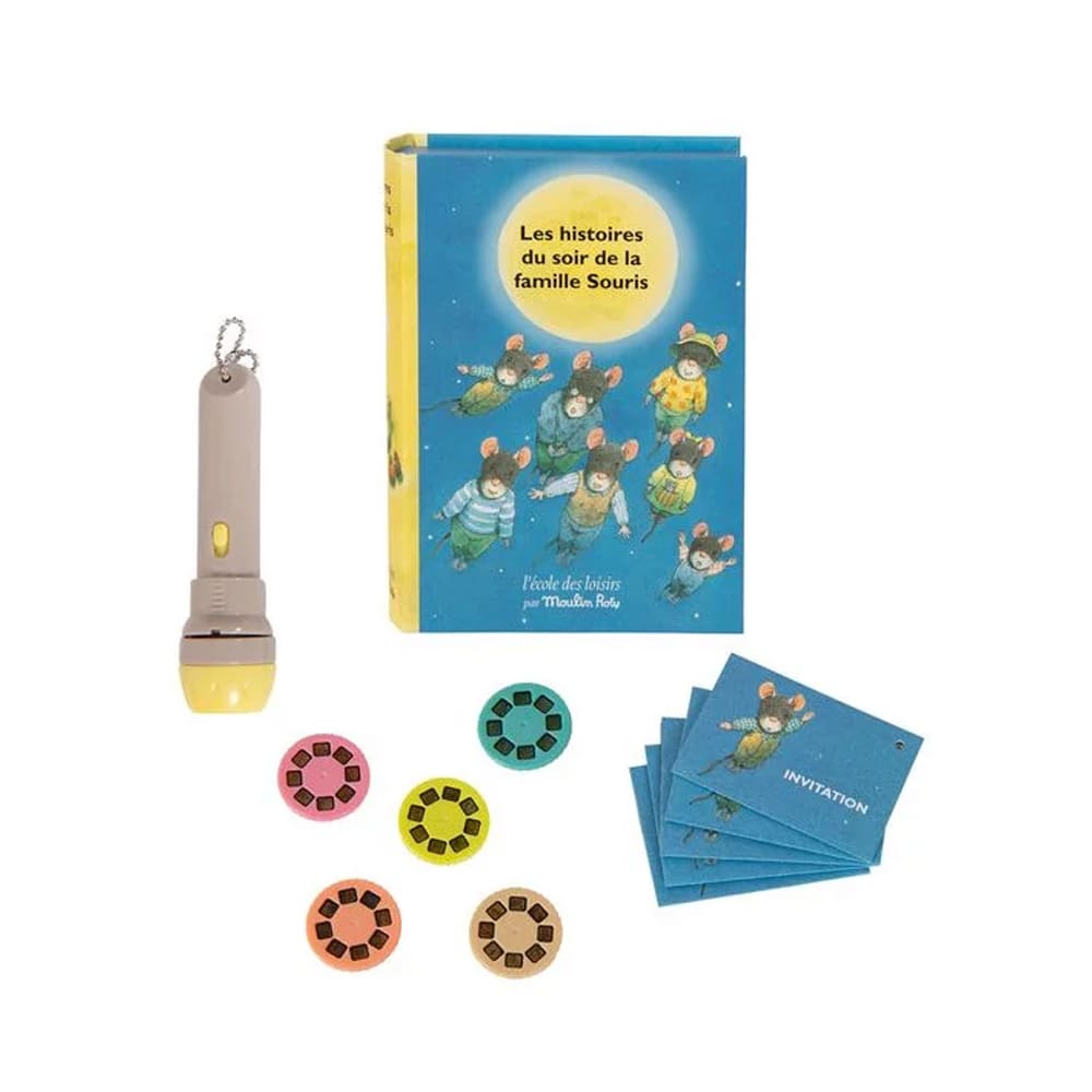 Un livre magique que l’on ouvre comme une boîte à trésors, qui renferme précieusement une lampe à projeter, 5 disques et 5 adorables invitations pour projeter de belles histoires sur son écran intégré. Grâce à ce joli cadeau, votre enfant pourra découvrir les aventures de la famille Souris, classique de l’école des loisirs