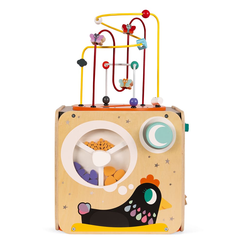 Un parcours plein de surprises attend bébé ! Ce maxi looping en bois propose diverses activités pour divertir votre tout-petit. Ce jouet d’éveil est composé d’une face sonore avec un moulin rempli d’œufs en bois de différentes tailles que l’enfant peut tourner à l’aide de la poignée et d’un bouton lune qui fait du bruit quand on l’actionne. Sur l’une des autres faces, on retrouve un engrenage de 3 roues, un miroir et une chenille dont chaque anneau tourne autour d’un axe pour dévoiler une nouvelle couleur. Ce jeu premier âge comporte également un labyrinthe, 5 pièces à encastrer pour apprendre les formes et les couleurs et un looping.