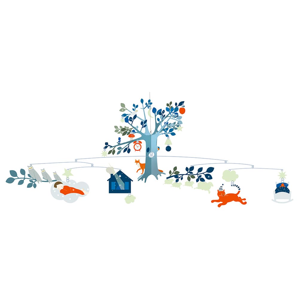Un grand mobile avec un arbre autour duquel tourne des animaux et des personnages.