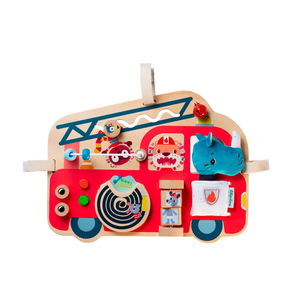 Ce panneau en bois représentant un camion de pompiers est riche en activités et matières pour stimuler les petits dans leurs découvertes. Se fixe facilement au parc grâce aux rubans velcro.