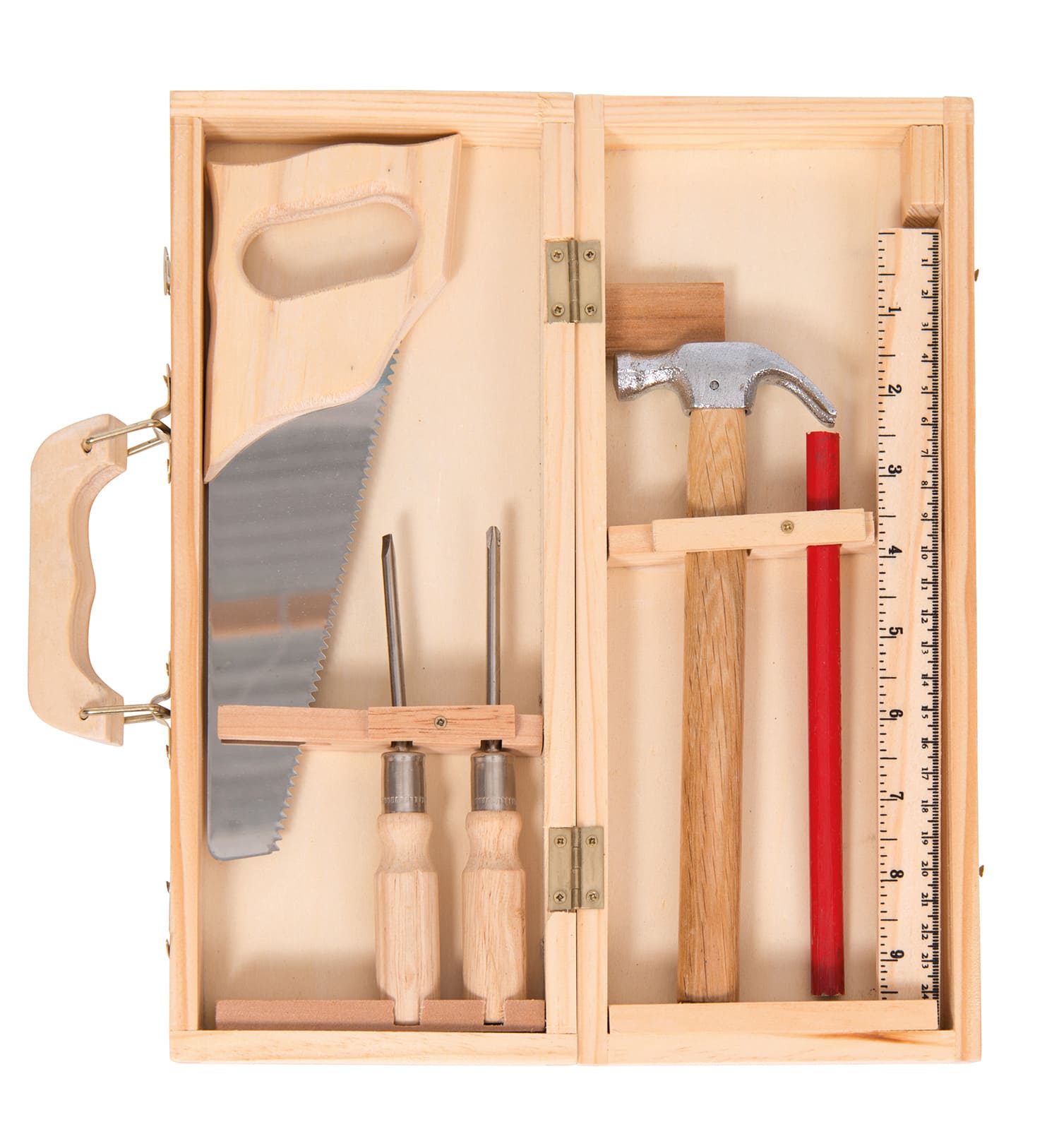 Tout l’univers de l’atelier bricolage contenu dans une petite valise en bois ! Pour faire comme les grands, se construire des mondes et se raconter des histoires, 6 vrais outils : une scie, un marteau, une règle et son crayon, des tournevis…