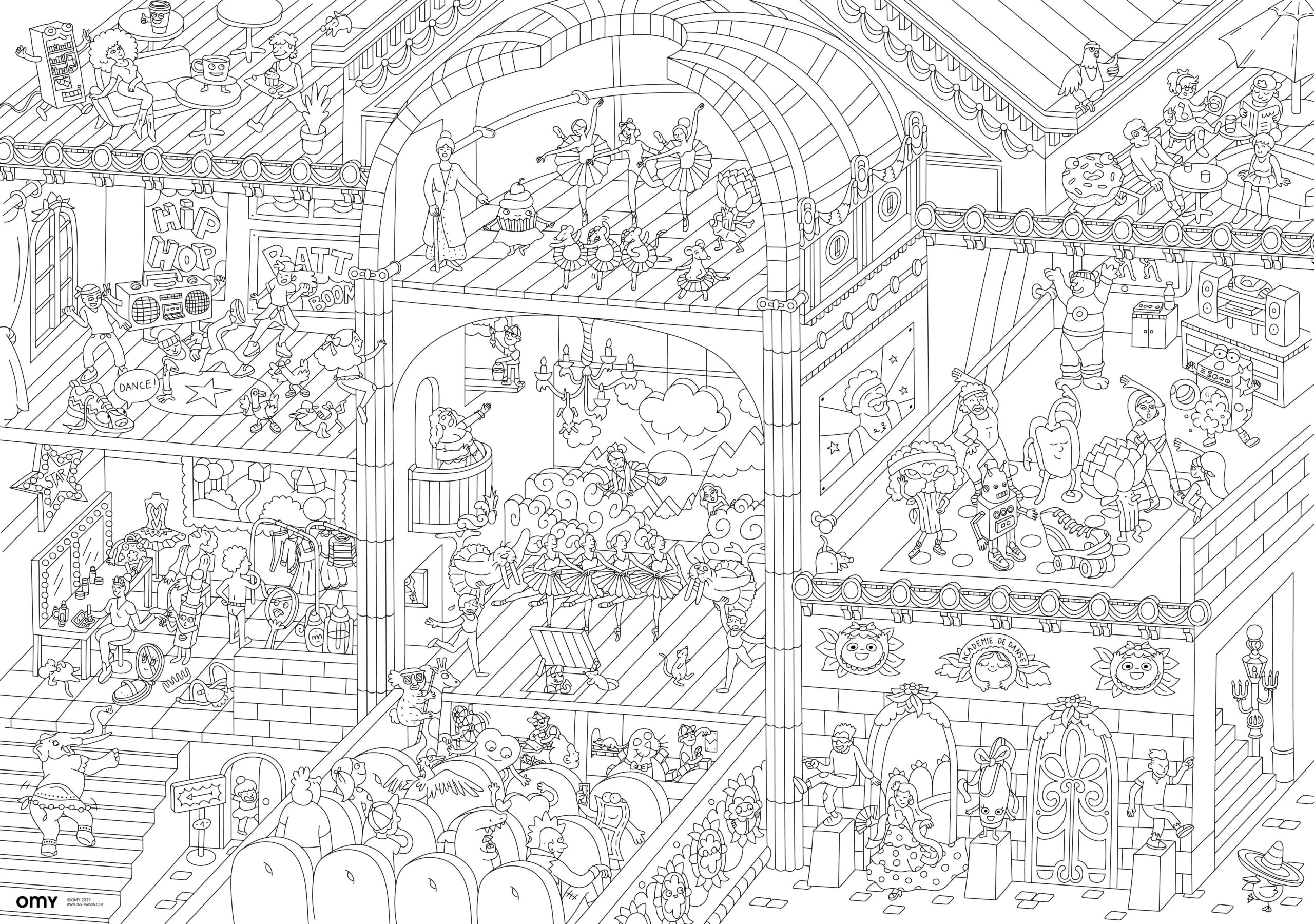Au rythme des chorégraphies, pointes, tutus, ballerines, petits rats de l’opéra et danseurs de hip-hop animent un spectacle à décorer et colorier.