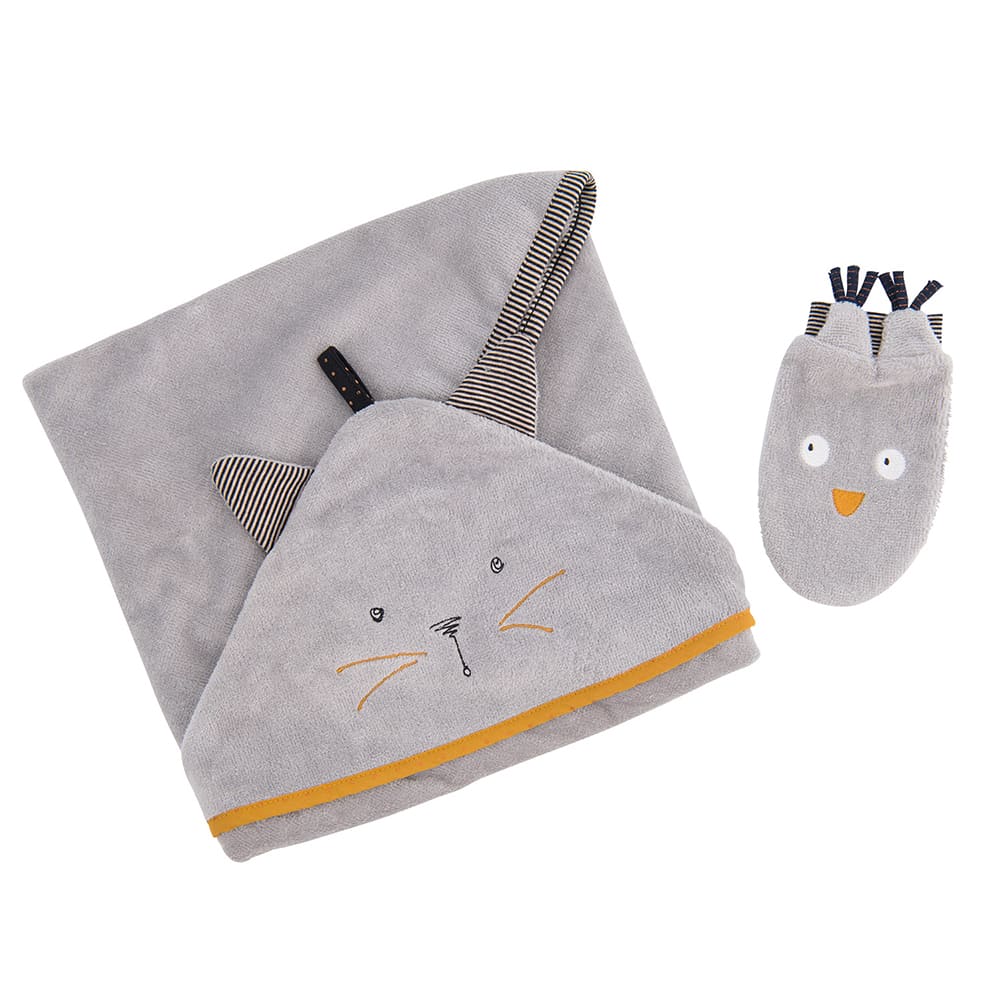 Pour envelopper bébé de douceur : gant petit hibou et sortie de bain tout en velours éponge gris avec capuche de lutin et petites oreilles de chat. Idéal pour un cadeau naissance.