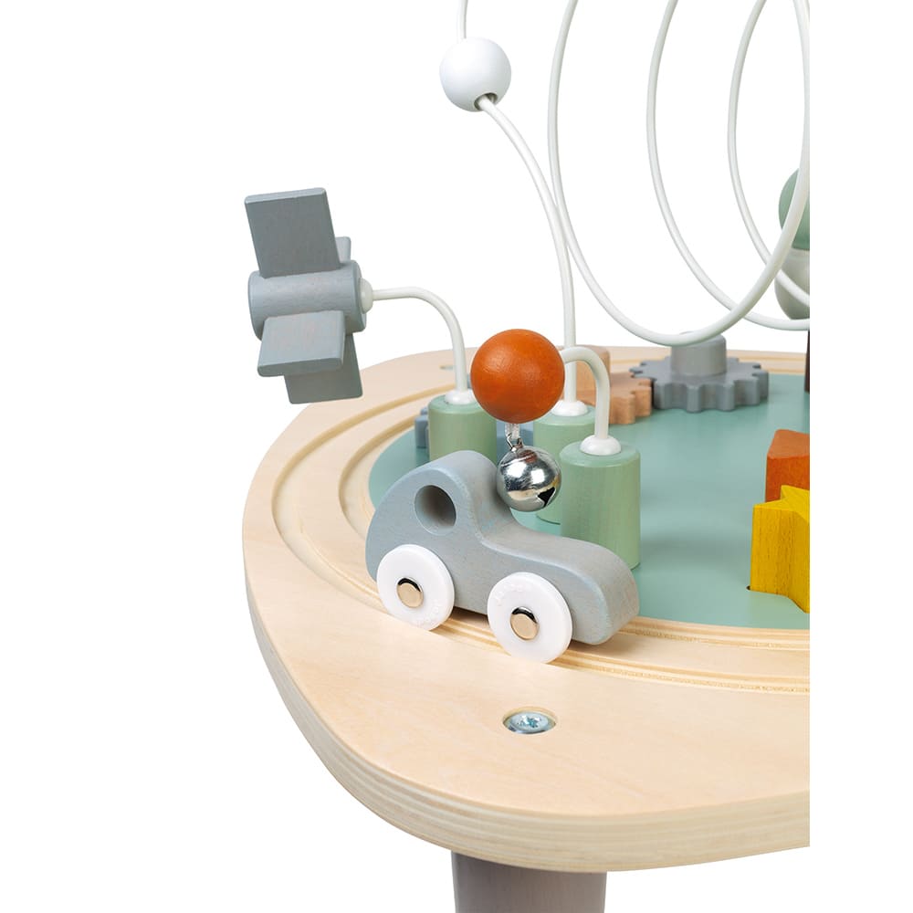 Cette table multi-activités en bois est parfaitement adaptée aux tout-petits ! Bébé va pouvoir toucher à tout et apprendre en s’amusant avec tous ces petits jeux : un rail de train circulaire avec 3 véhicules, 2 arbres à empiler, 3 loopings avec des billes, un moulin et une clochette, 3 engrenages à faire tourner et 5 formes à encastrer. Cette table multi-activités est équipée de pieds anti-dérapants pour plus de stabilité. Ce jouet en bois fait partie de la collection Sweet Cocoon, une gamme aux couleurs délicates, inspirée des tendances actuelles pour accompagner les premiers apprentissages de votre enfant tout en douceur !