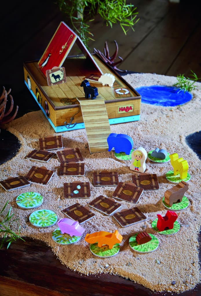 Il pleut depuis des heures ! Les joueurs aident Noé à faire monter les animaux et tous leurs bagages sur l’arche ! Pour ce faire, ils cherchent la tuile « valise » correspondant à chaque animal et mémorisent l’emplacement des valises mouillées. Les joueurs gagnent la partie tous ensemble si tous les animaux sont sur le bateau avant l’inondation.