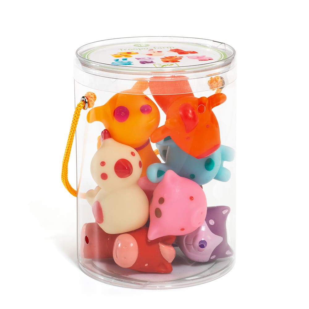 7 animaux en plastique dans un tube pour s’amuser et se raconter des histoires. Ce tube comprend 7 animaux de la ferme en plastique souple et très coloré : poule, cochon, chien, lapin, vache, chat et cheval. Votre enfant va s’amuser avec ces animaux et les machouiller sans danger.