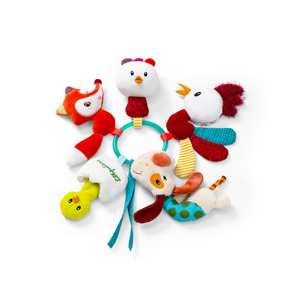 Jef, Alice, Ophélie, John et le poussin caché dans sa coquille font la ronde en se tenant à un anneau. Agrippe le hochet et découvre ce que chaque compère t’a réservé. Fais une petite caresse au nez de Jef et il se mettra à clignoter !